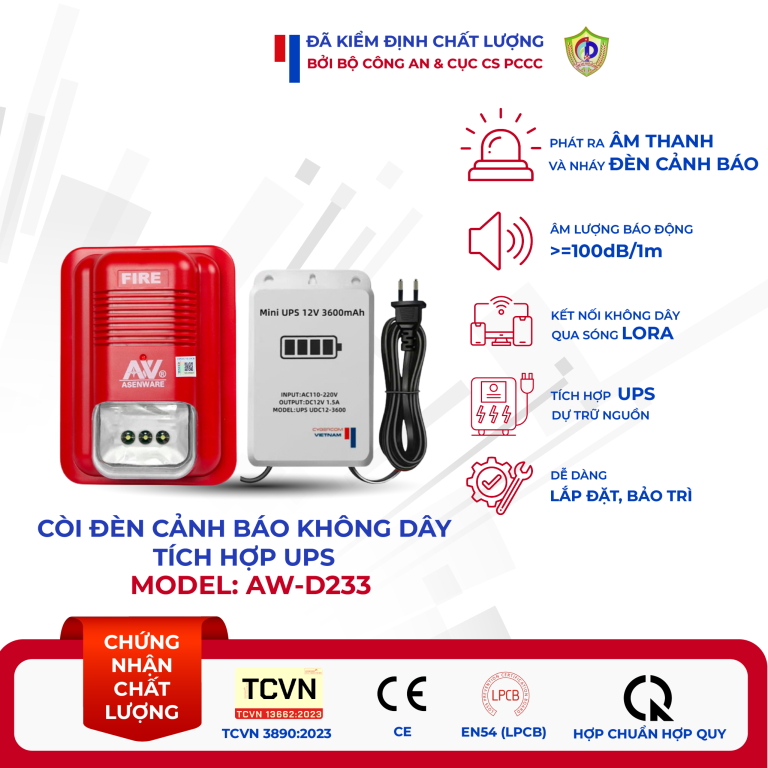 – Còi đèn cảnh báo không dây tích hợp UPS AW-D233 là giải pháp cảnh báo thông minh, kết hợp đèn báo cháy và còi báo động không dây có địa chỉ với nguồn lưu điện UPS 12V 2A. Sản phẩm cho phép xác định chính xác vị trí sự cố khi có cháy, phát ra âm thanh và ánh sáng cảnh báo rõ ràng ngay tại điểm được chỉ định
